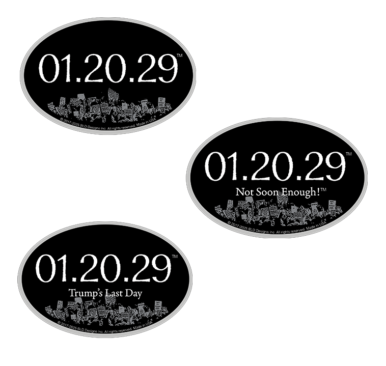 This is a variety pack featuring all three of our popular 01.20.29™ Trump’s Last Day Euro stickers. These stickers serve as a symbol marking the anticipated conclusion of Donald Trump’s second term. Whether you’re a political activist, a collector of memorabilia, or someone who is just plain fed up, this Euro stands as a testament to democratic transitions and the ever-evolving political landscape.  Union-made in the USA, 4”x6” weatherproof removable Euro sticker. Stick one on your car, truck, computer, and locker.